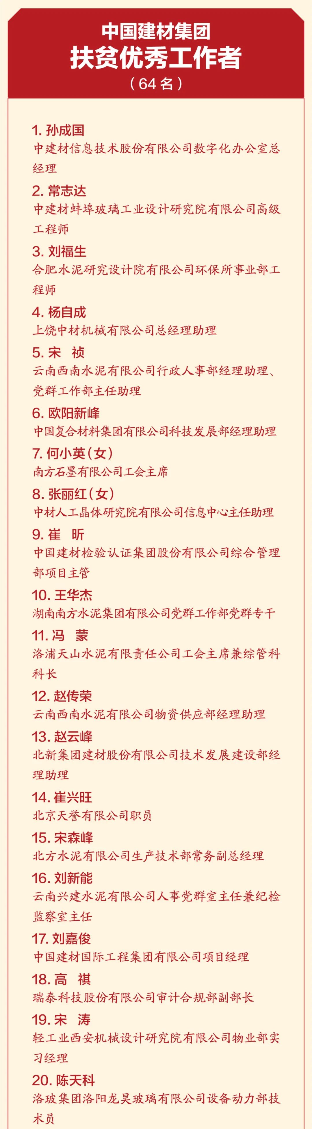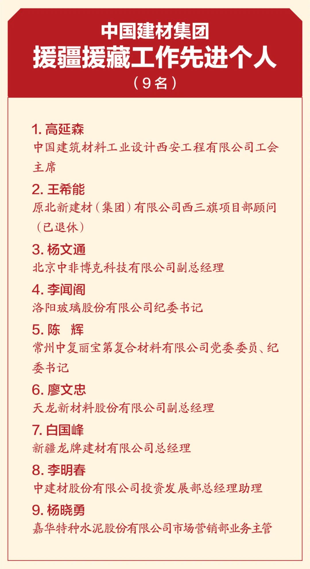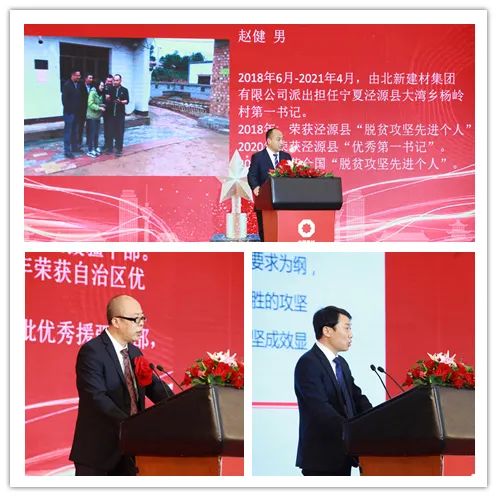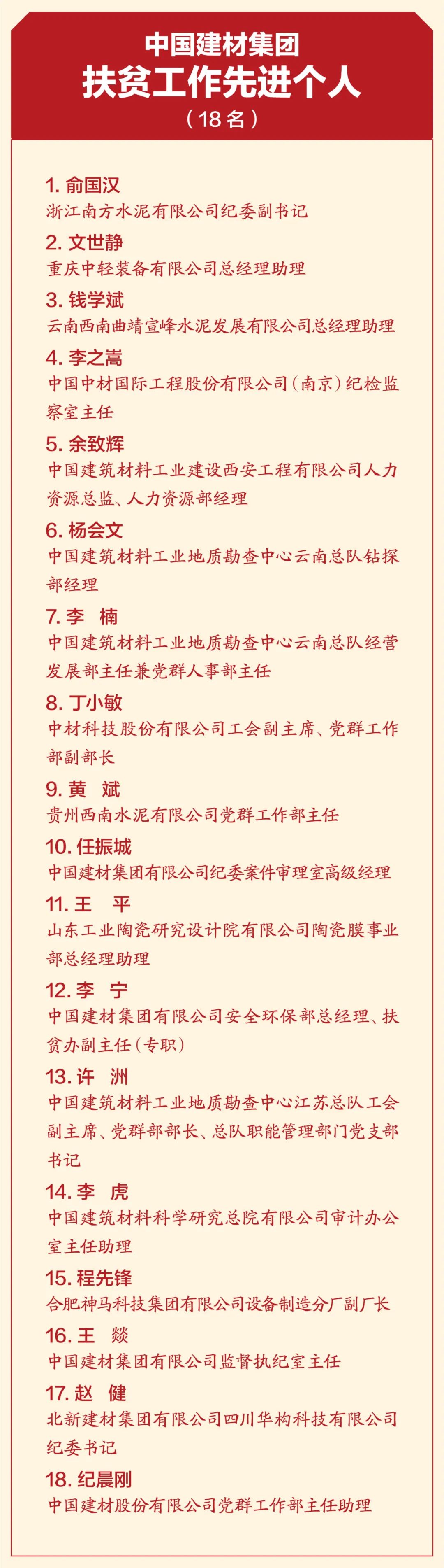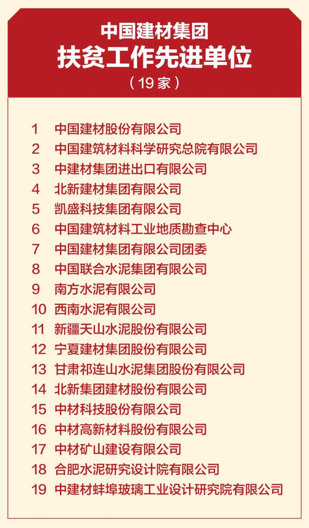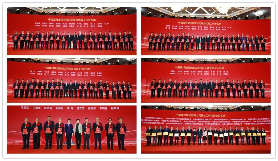 曹江林宣讀表彰決定,黨的十八大以來,集團(tuán)積極響應(yīng)習(xí)近平總書記號(hào)召,認(rèn)真貫徹落實(shí)黨中央、國(guó)務(wù)院和上級(jí)有關(guān)單位關(guān)于脫貧攻堅(jiān)決策部署,集全集團(tuán)之力,盡銳出戰(zhàn)、合力攻堅(jiān)。2020年我國(guó)脫貧攻堅(jiān)戰(zhàn)取得了全面勝利,區(qū)域性整體貧困得到解決,完成了消除絕對(duì)貧困的艱巨任務(wù)。集團(tuán)定點(diǎn)幫扶的五個(gè)縣區(qū)已脫貧出列,援疆援藏工作也取得了階段性成果。為表彰在脫貧攻堅(jiān)及援疆援藏工作中涌現(xiàn)出的先進(jìn)個(gè)人和先進(jìn)集體,充分展現(xiàn)脫貧攻堅(jiān)成效成果,經(jīng)集團(tuán)黨委研究決定:授予中國(guó)建材股份有限公司等19家成員企業(yè)“扶貧工作先進(jìn)單位”稱號(hào),授予俞國(guó)漢等18名同志“扶貧工作先進(jìn)個(gè)人”稱號(hào),授予高延森等9名同志“援疆援藏工作先進(jìn)個(gè)人”稱號(hào),授予孫成國(guó)等64名同志“扶貧優(yōu)秀工作者”稱號(hào)。