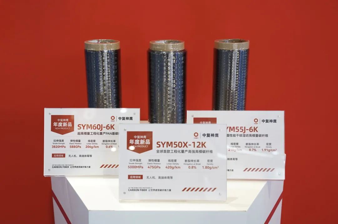 三款高強(qiáng)高模系列新品全球首發(fā),全球首款工程化量產(chǎn)高強(qiáng)高模碳纖維SYM50X-12K、高界面性能干噴濕紡高模量碳纖維SYM55J-6K、SYM60J-6K以真正的性能指標(biāo)高度和規(guī)?;a(chǎn)能力面世,一舉填補(bǔ)國產(chǎn)高端應(yīng)用空白,為航空航天、高端體育等領(lǐng)域帶來進(jìn)階的應(yīng)用方案。