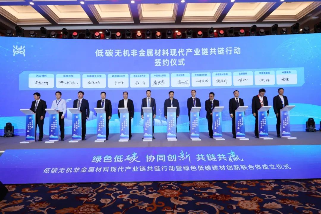 在國務(wù)院國資委和中國建筑材料聯(lián)合會共同見證下,中國建材集團有限公司、中國建筑集團有限公司、安徽海螺水泥股份有限公司、福耀玻璃工業(yè)集團股份有限公司、武漢理工大學(xué)等15家聯(lián)合體共建單位共同舉行了低碳無機非金屬材料現(xiàn)代產(chǎn)業(yè)鏈共鏈行動啟動儀式。中國建材集團有限公司、中國五礦集團有限公司、中國建筑集團有限公司、清華大學(xué)、同濟大學(xué)、中國科學(xué)院過程工程研究所、安徽海螺水泥股份有限公司等14家單位共同舉行了綠色低碳建材創(chuàng)新聯(lián)合體成立儀式。