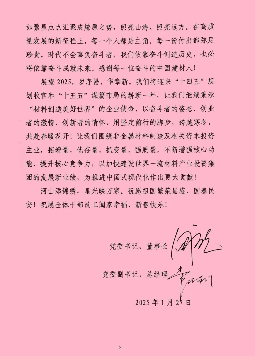 展望2025,歲序易,華章新。我們將迎來“十四五”規(guī)劃收官和“十五五”謀篇布局的嶄新一年,讓我們繼續(xù)秉承“材料創(chuàng)造美好世界”的企業(yè)使命,以奮斗者的姿態(tài)、創(chuàng)業(yè)者的激情、創(chuàng)新者的情懷,用堅定前行的腳步,跨越寒冬,共赴春暖花開!讓我們圍繞非金屬材料制造及相關(guān)資本投資主業(yè),拓增量、優(yōu)存量、抓變量、強質(zhì)量,不斷增強核心功能、提升核心競爭力,以加快建設(shè)世界一流材料產(chǎn)業(yè)投資集團(tuán)的發(fā)展新業(yè)績,為推進(jìn)中國式現(xiàn)代化作出更大貢獻(xiàn)!