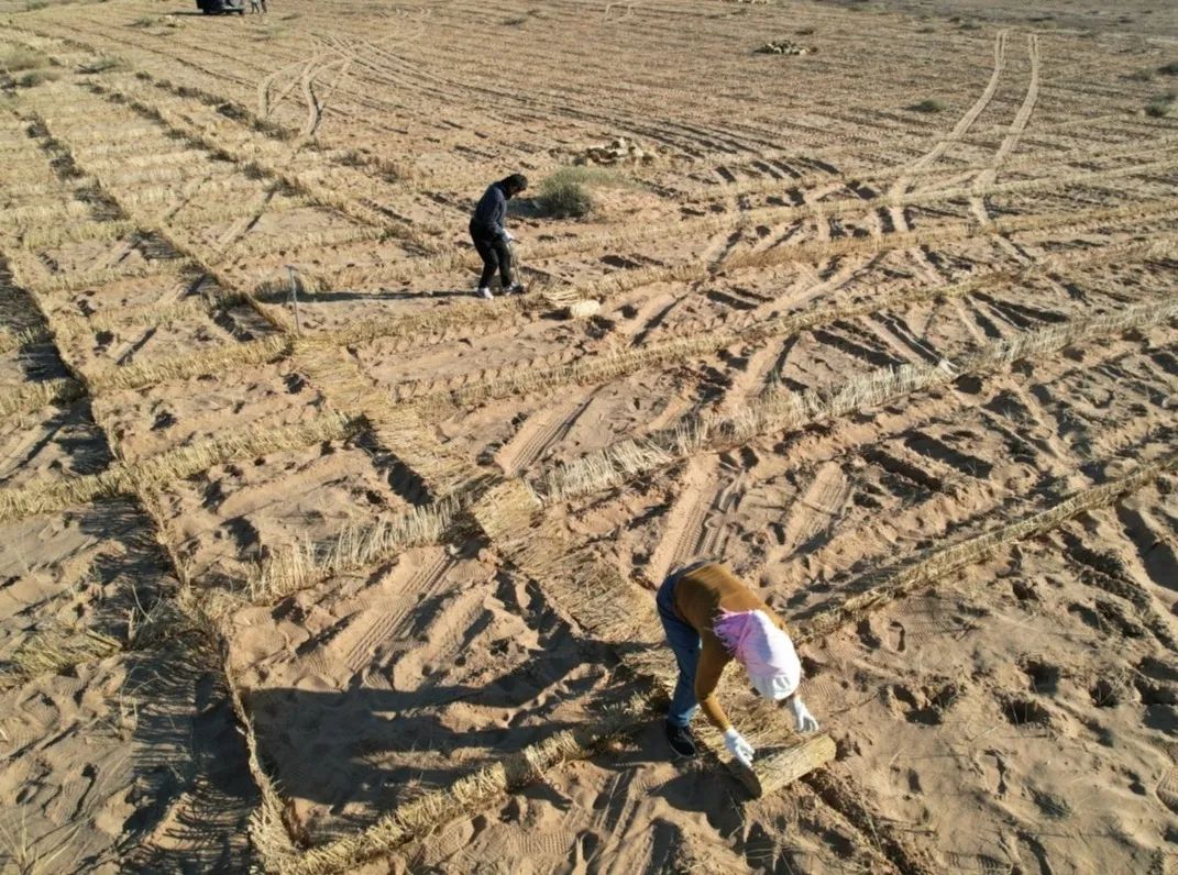 鋪設(shè)500畝稻草簾沙障、