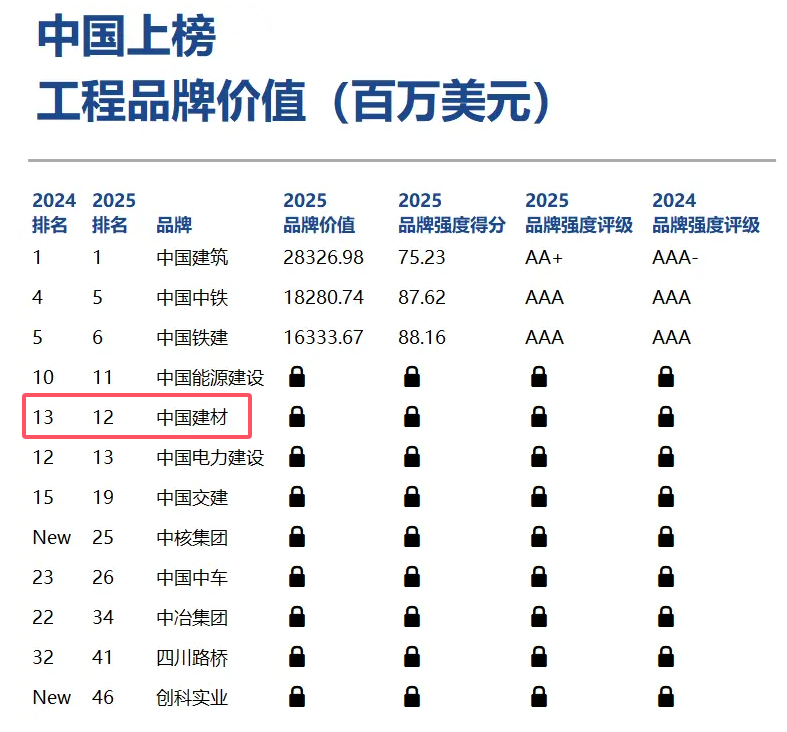 在該榜單中,中國建材的品牌價值逆勢增長了0.7%,達到91.1億美元,排名較2024年上升一位,成為2025年唯一實現(xiàn)排名提升的中國品牌。