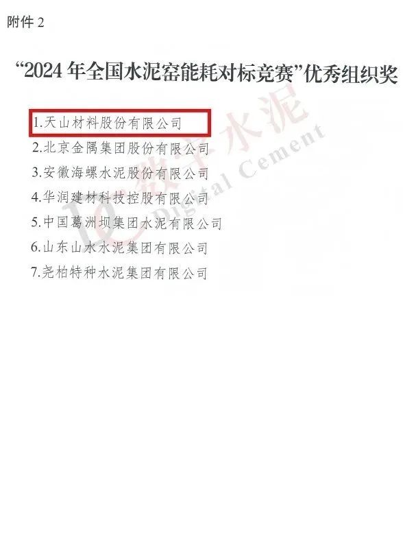 來源:集團(tuán)安全環(huán)保部 發(fā)布時間:2025-06-266月19日,中國機(jī)械冶金建材工會全國委員會和中國水泥協(xié)會聯(lián)合發(fā)布關(guān)于“2024年全國水泥窯能耗對標(biāo)競賽”評審結(jié)果的通報,天山材料及所屬企業(yè)成績優(yōu)異,榮獲“水泥行業(yè)能效標(biāo)桿窯”“水泥行業(yè)能效示范窯”“水泥行業(yè)能效先進(jìn)窯”“競賽優(yōu)秀組織獎”等4個獎項(xiàng)。
