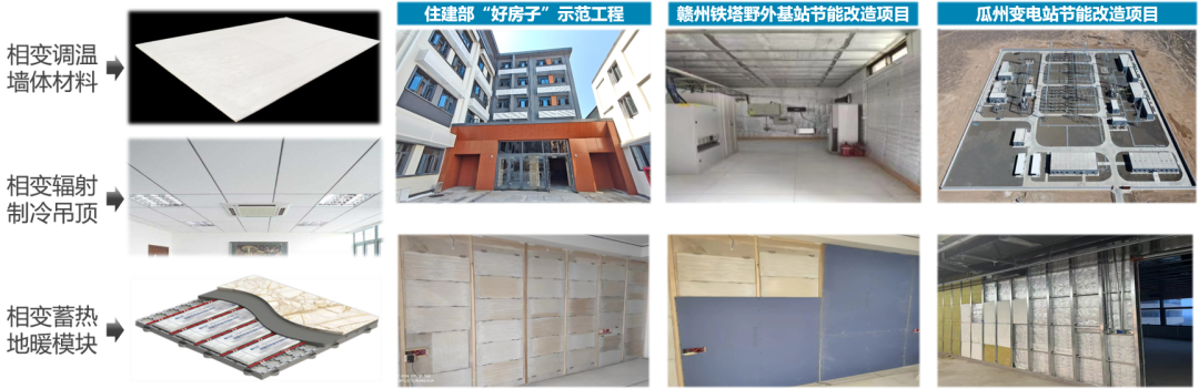 通過二次封裝技術(shù),相變材料已實(shí)現(xiàn)建材化,產(chǎn)品形式包括:裝飾一體化相變調(diào)溫板材、相變輻射制冷吊頂系統(tǒng)、相變蓄熱地暖模塊等。應(yīng)用案例包括住建部“好房子”示范工程CCB建融家園裝修改造項(xiàng)目、贛州鐵塔野外基站節(jié)能改造項(xiàng)目、瓜州變電站節(jié)能改造項(xiàng)目等。在河南某辦公樓地暖相變蓄能改造項(xiàng)目中,節(jié)能率達(dá)20%,通過峰谷電套利年省電費(fèi)達(dá)55%。