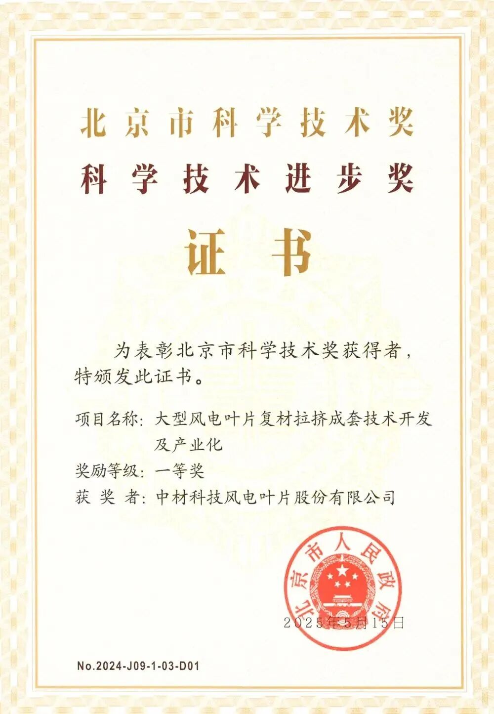 近日,2024年度北京市科學技術獎勵大會在京召開,由中材科技股份有限公司所屬中材科技風電葉片股份有限公司(簡稱“中材葉片”)牽頭,聯(lián)合北京玻鋼院復合材料有限公司、泰山玻璃纖維有限公司等多家單位共同完成的大型風電葉片復材拉擠成套技術開發(fā)及產(chǎn)業(yè)化項目,榮獲2024年度北京市科學技術獎科技進步獎一等獎。