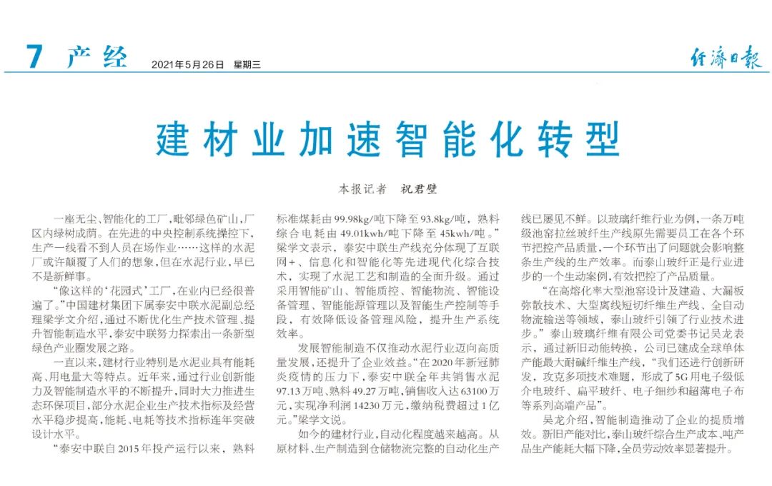《經(jīng)濟日報》“走進中建材” ,報道建材業(yè)加速智能化轉(zhuǎn)型 | 泰安站
