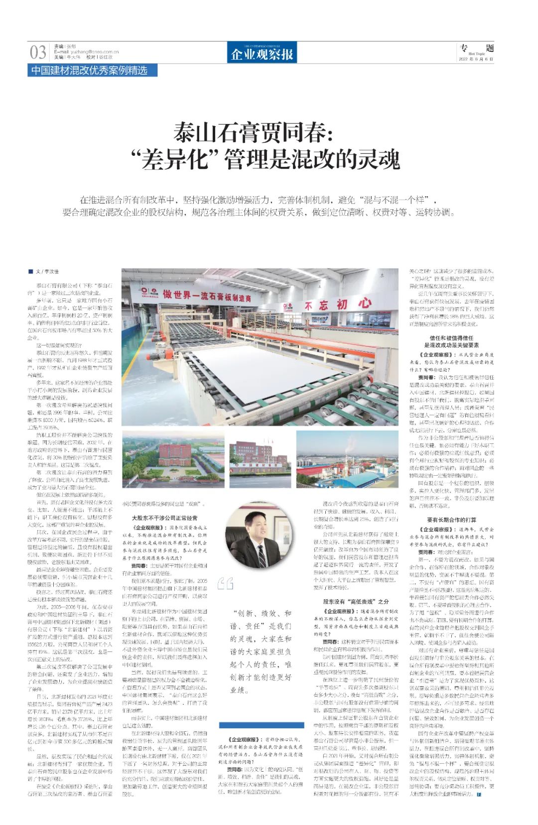 改革親歷者訪談 | 《企業(yè)觀察報(bào)》專訪泰山石膏賈同春:“差異化”管理是混改的靈魂
