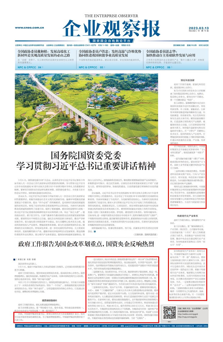 來源:企業(yè)觀察報(bào) 發(fā)布時(shí)間:2023-03-20當(dāng)前,全國上下正在深入開展學(xué)習(xí)貫徹習(xí)近平總書記在全國兩會(huì)期間的重要講話精神和全國兩會(huì)精神,《企業(yè)觀察報(bào)》“兩會(huì)同期聲”欄目刊登了《政府工作報(bào)告為國企改革劃重點(diǎn),國資央企反響熱烈》,報(bào)道了中國建材集團(tuán)黨委書記、董事長周育先接受采訪講述集團(tuán)改革創(chuàng)新發(fā)展的生動(dòng)實(shí)踐。小料將相關(guān)內(nèi)容分享給大家。
