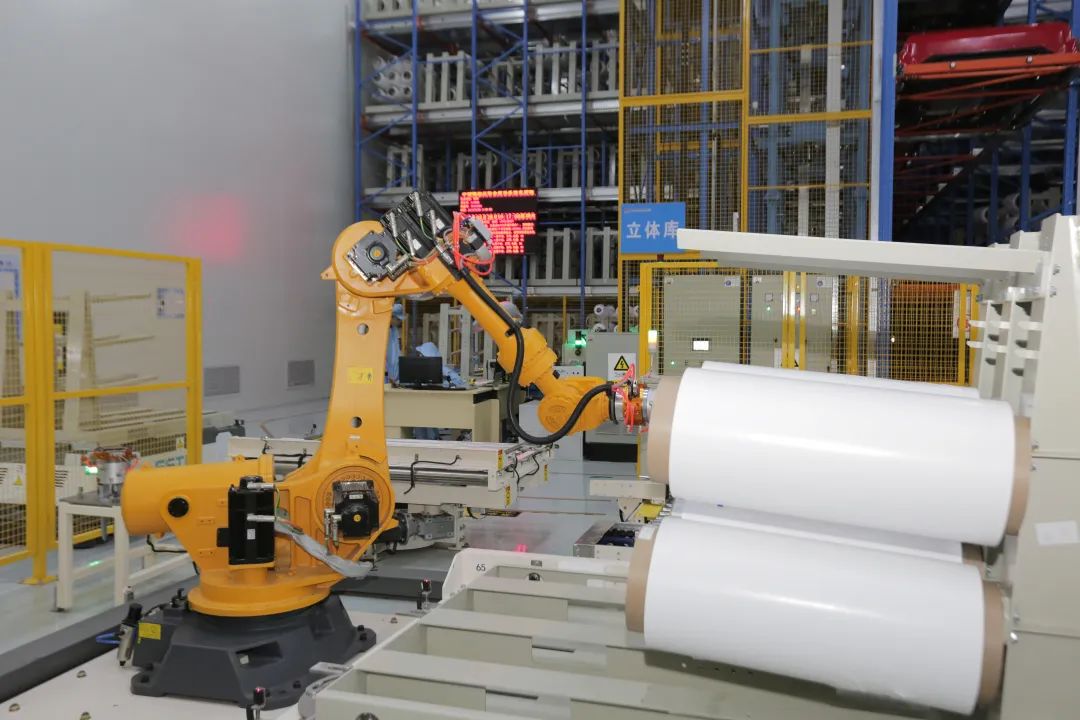 位于山東滕州的中材鋰膜有限公司(下稱“中材鋰膜”)車間物流區(qū),11臺機器人物流車沿著地上的黃色軌道,載著一卷卷標(biāo)有型號、數(shù)字條碼的鋰電池隔膜,經(jīng)過接貨、送貨、檢查、再加工的工序后,送至全自動立體倉儲庫。
