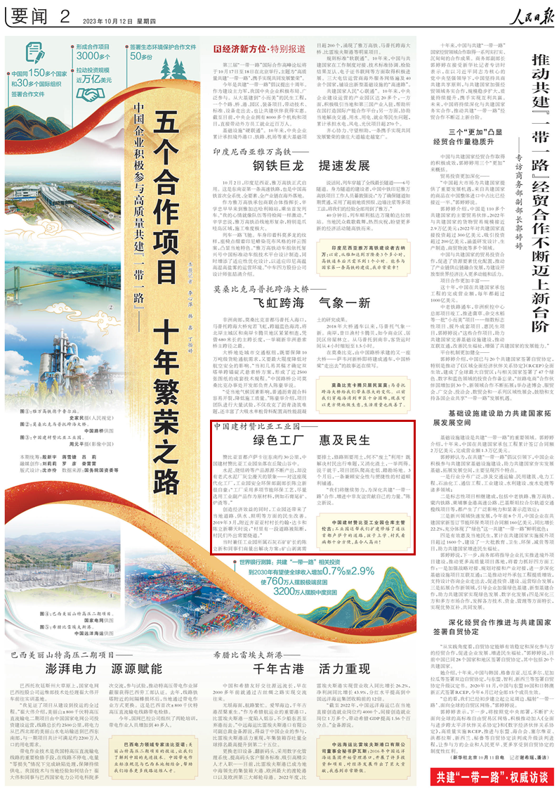來源:人民日報(bào) 發(fā)布時(shí)間:2023-10-1610月12日,《人民日報(bào)》要聞版刊發(fā)《中國企業(yè)積極參與高質(zhì)量共建“一帶一路”——五個合作項(xiàng)目 十年繁榮之路》,報(bào)道了中國建材贊比亞工業(yè)園綠色工廠惠及民生的故事。