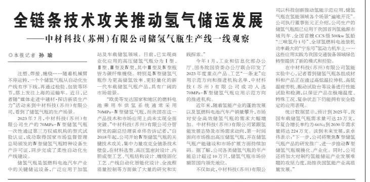 今年1月,工業(yè)和信息化部辦公廳、國務院國資委辦公廳聯(lián)合印發(fā)了2023年度重點產(chǎn)品、工藝“一條龍”應用示范方向和推進機構名單,中材科技(蘇州)有限公司成功入選70MPa-Ⅳ型儲氫氣瓶應用示范方向的推進機構。