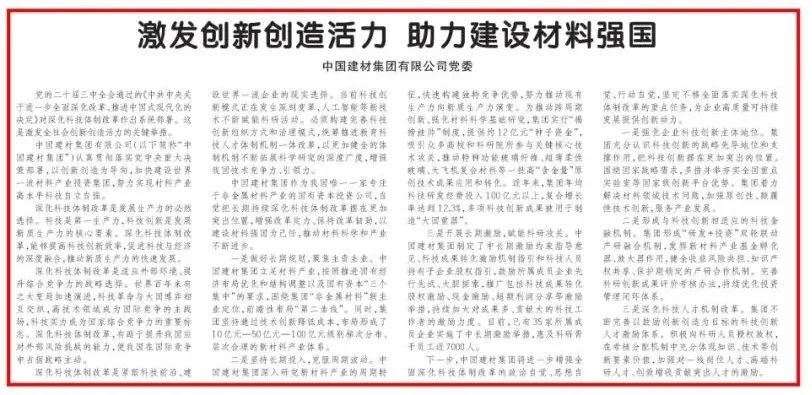 來源:《科技日報》、集團(tuán)黨群工作部(黨委宣傳部) 發(fā)布時間:2024-10-09近日,《科技日報》專論刊發(fā)中國建材集團(tuán)有限公司黨委署名文章,文章圍繞“激發(fā)創(chuàng)新創(chuàng)造活力 助力建設(shè)材料強(qiáng)國”展開論述,闡述中國建材集團(tuán)深化科技體制改革促進(jìn)科技與經(jīng)濟(jì)的深度融合,推動材料科學(xué)和產(chǎn)業(yè)不斷進(jìn)步的實(shí)踐。下面一起來看詳細(xì)內(nèi)容~