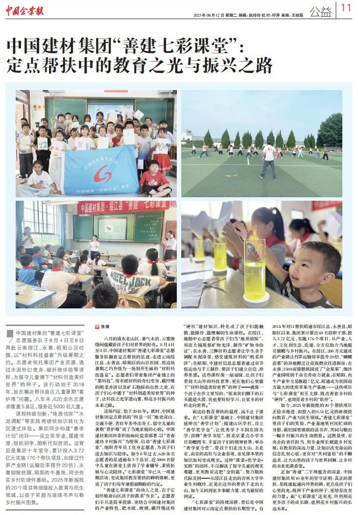 來源:中國企業(yè)報 發(fā)布時間:2025-08-18近日,《中國企業(yè)報》刊發(fā)《“善建七彩課堂”——定點幫扶中的教育之光與振興之路》一文,講述中國建材集團“善建七彩課堂”志愿服務(wù)隊于8月4日至8日再赴云南綏江、永善、昭陽山區(qū)校園,循著集團定點幫扶的足跡,以“材料科技大餐”升級暑期之約,展現(xiàn)中國建材的責(zé)任與擔(dān)當(dāng)。跟著小料來看看詳細內(nèi)容吧~