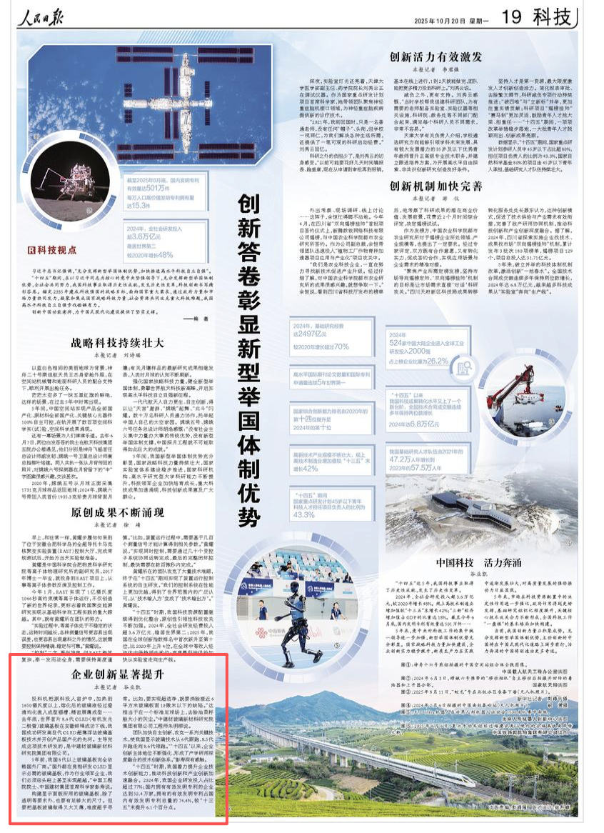 來源:人民日?qǐng)?bào) 發(fā)布時(shí)間:2025-10-2310月20日,《人民日?qǐng)?bào)》整版聚焦“十四五”期間的創(chuàng)新科技成果,彰顯我國新型舉國體制優(yōu)勢(shì)。其中,《企業(yè)創(chuàng)新顯著提升》一文報(bào)道中國建材集團(tuán)旗下中建材玻璃新材料研究院成功研發(fā)全球首片8.6代OLED超薄浮法玻璃基板,打破高世代玻璃基板長期被國外壟斷的局面,實(shí)現(xiàn)我國顯示玻璃技術(shù)從跟跑到領(lǐng)跑的跨越,展現(xiàn)企業(yè)創(chuàng)新主體地位和產(chǎn)學(xué)研融合體系的顯著提升。一起來看看全文報(bào)道吧!
