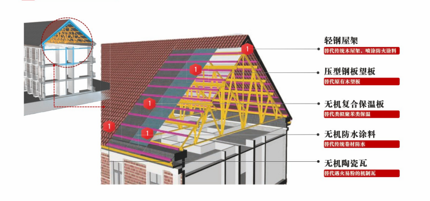 在近70年的老舊小區(qū)改造中,中國建材集團(tuán)發(fā)揮產(chǎn)業(yè)鏈優(yōu)勢,統(tǒng)籌所屬北新建材、國檢集團(tuán)等十余家專業(yè)企業(yè),形成覆蓋設(shè)計(jì)、材料、施工、檢測的全鏈條解決方案。針對大屋脊結(jié)構(gòu)消防隱患與功能缺陷,中國新材院、咸陽陶瓷院設(shè)計(jì)輕鋼屋架體系,提升耐久性與抗震性能;北新燈塔更新產(chǎn)品設(shè)計(jì),將防火涂料從耐火極限的2.5小時(shí),提高到4.5小時(shí),全面提高輕鋼屋架體系的耐火極限;中巖科技、山東工陶院提供A級無機(jī)保溫材料,實(shí)現(xiàn)防火保溫雙升級;江西中材研發(fā)發(fā)泡陶瓷防火隔離帶,構(gòu)建多層防護(hù)體系;北新防水、水泥新材院分別通過耐熱防水卷材、無機(jī)復(fù)合防水材料,實(shí)現(xiàn)防水防火的雙升級;國檢集團(tuán)與中存大數(shù)據(jù),打造智慧監(jiān)測系統(tǒng),提升居住安全性;咸陽陶瓷院推出高吸水率A級防火陶瓷瓦,兼顧實(shí)用與美觀。該綜合解決方案推動(dòng)木質(zhì)大屋脊向“不燃、耐久、綠色、節(jié)能”現(xiàn)代屋頂系統(tǒng)轉(zhuǎn)型,相關(guān)技術(shù)已在2025年11月北京鳥巢消防技術(shù)交流展中亮相,為全國同類項(xiàng)目提供可推廣應(yīng)用路徑。