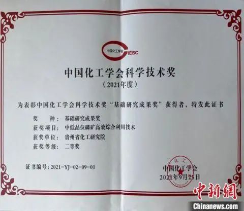 2021年9月,貴州省化工研究院的中低品位磷礦高效綜合利用技術(shù)獲中國化工學會基礎(chǔ)研究成果二等獎。