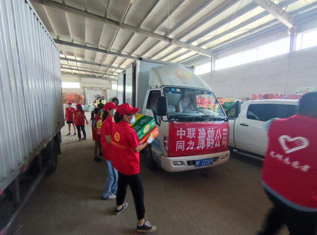 ▲豫鶴同力捐贈防汛物資到達浚縣卸車