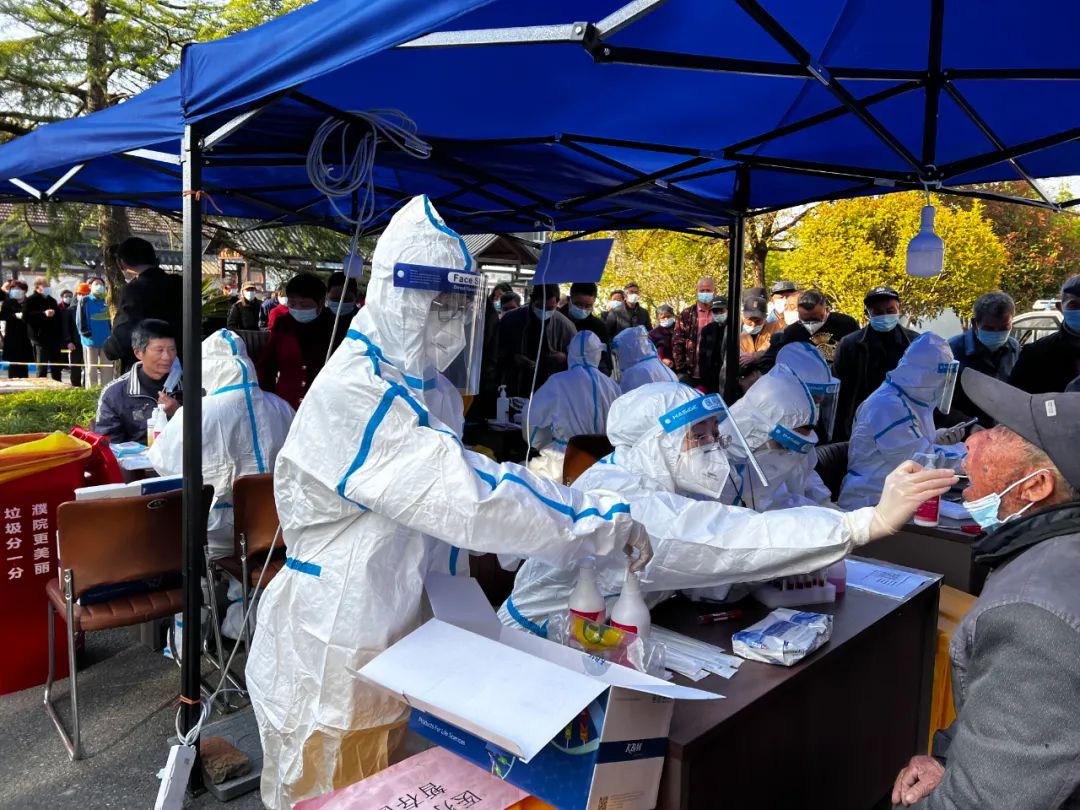 接下來幾天,我們又去了下一個社區(qū)。準(zhǔn)備工作做在前,打有準(zhǔn)備之“仗”。穿好防護服,戴好口罩、手套、防護罩,穿好鞋套,進入現(xiàn)場。小組成員有序地分工協(xié)作:有入戶走訪排查登記、手持手機掃碼、發(fā)放自檢試劑盒的;有維護現(xiàn)場秩序的:“請保持兩米距離打開吉祥碼”;有拿著擴音器走樓串棟不斷“吆喝”的:“居民朋友你們好,核酸檢測開始了,請聽到棟次下樓檢測”;還有默默地一遍遍對現(xiàn)場工作人員、周邊環(huán)境和醫(yī)用品垃圾袋進行消殺的……大家齊心協(xié)力,配合默契,做好每一項工作。每天都有熱心的居民送來暖寶寶、鞋墊等,不停地對我們說“辛苦了,你們辛苦了……”,我們的心也跟著熱了。