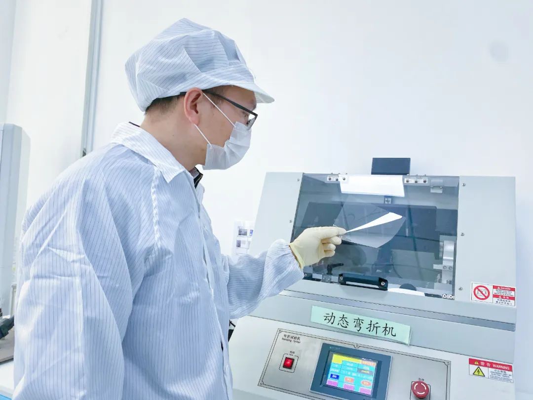 如何突破?一切從零開(kāi)始,沒(méi)有設(shè)備、沒(méi)有玻璃、沒(méi)有重要輔材,面對(duì)“三無(wú)”的困難處境,大伙摸著石頭過(guò)河,互相鼓勵(lì)、互相打氣,“白加黑、五加二”,以廠為家,找遍國(guó)內(nèi)所設(shè)備、輔材相關(guān)供應(yīng)商。與此同時(shí),楊金發(fā)按照工藝流程,建立“專(zhuān)項(xiàng)攻關(guān)小組”,設(shè)立專(zhuān)項(xiàng)小組負(fù)責(zé)人,對(duì)工藝研發(fā)、良率提升等關(guān)鍵核心專(zhuān)項(xiàng)突破,為攻克“筆跌及彎折性能”等相關(guān)參數(shù),開(kāi)啟為期近半年之久的全封閉模式,一邊從理論出發(fā)科研攻關(guān),一邊推行“試錯(cuò)”管理辦法,側(cè)面突圍。
