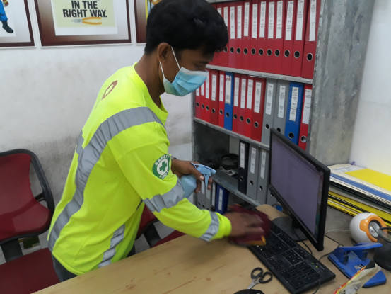 很快,6月份政府同意菲律賓子公司復產了,我依然每天第一個來公司,對門窗把手、辦公桌椅、對講機等辦公場所每個角落打掃衛(wèi)生、進行消毒,每天兩次按時給員工測溫,對疫情防控毫不放松。