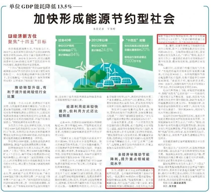 我國是能源消費大國,節(jié)能潛力巨大。“十四五”規(guī)劃綱要將“單位GDP能源消耗降低13.5%”作為經(jīng)濟(jì)社會發(fā)展主要約束性指標(biāo)之一。在實現(xiàn)碳達(dá)峰碳中和目標(biāo)背景下,怎么理解這一指標(biāo)的意義?如何保障順利實現(xiàn)?人民日報記者采訪了相關(guān)部門和專家,并采訪了中建材蚌埠玻璃工業(yè)設(shè)計研究院,作為“多措并舉推動節(jié)能降耗、提升重點領(lǐng)域能效水平”的典型案例。