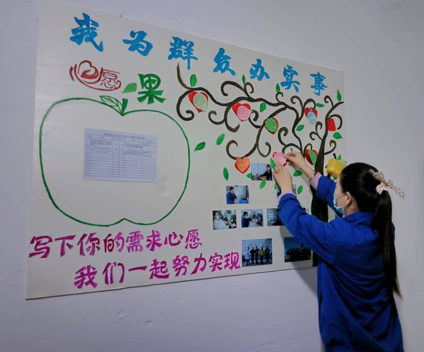 精準突破黨小組采取“1+2”工作模式打通關(guān)心關(guān)愛群眾的“最后一公里”?!?”是黨小組9名黨員聚焦職工的“微心愿”為問題導向;職工把自己的“微心愿”或困難訴求用便簽貼在控制組辦公室“心愿樹”看板上,并署上自己的姓名?!?”是黨員撕下貼紙認領(lǐng)“微心愿”+幫助職工實現(xiàn)“心愿果”責任落實。通過“一名黨員認領(lǐng)一件或多件”“多名黨員認領(lǐng)一件”等方式,黨小組按照“三個一”嚴抓落實;安排專人每日一收集整理“微心愿”,每周一上會討論,并制定解決措施。黨小組能解決的,限時解決;一時解決不了的,上報公司黨支部協(xié)助解決,并將“心愿果”落實情況每月一公示,對于“微心愿”落實結(jié)果由訴求職工用“紅五星”在看板表示“滿意”。