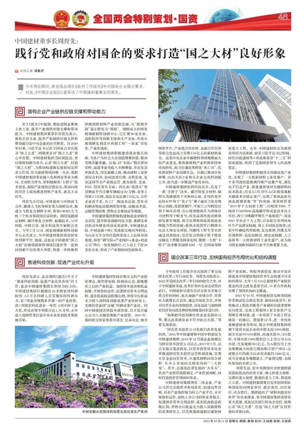 2022年是國企改革三年行動的收官之年,今年全國兩會期間,李克強總理在《政府工作報告》中對國有企業(yè)提出要求,中國建材集團作為中國建材領域唯一的央企,如何發(fā)揮好央企龍頭帶動作用尤為關鍵。對此,《中國企業(yè)報》采訪了中國建材集團黨委書記、董事長周育先。