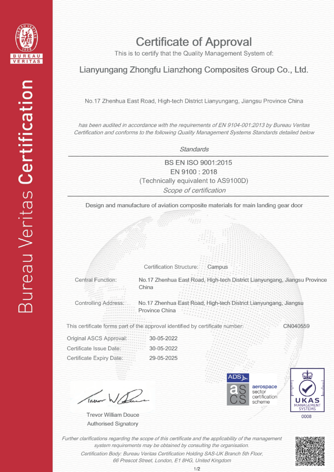 5月30日,連云港中復(fù)連眾復(fù)合材料集團(tuán)有限公司取得AS/EN9100D航空航天質(zhì)量管理體系認(rèn)證證書(shū),獲得國(guó)際航空航天質(zhì)量聯(lián)盟IAQG認(rèn)可。AS9100是國(guó)際航空航天行業(yè)以ISO9001質(zhì)量體系要求為基礎(chǔ),專(zhuān)門(mén)制定的航空航天標(biāo)準(zhǔn),其中加入了航空航天行業(yè)所建立的有關(guān)質(zhì)量體系的附件要求,以滿足DOD、NASA以及FAA等監(jiān)管機(jī)構(gòu)的質(zhì)量要求,是國(guó)際航空航天行業(yè)市場(chǎng)準(zhǔn)入的先決條件。目前,中復(fù)連眾已建成潔凈間,配備熱壓罐、自動(dòng)裁剪機(jī)及激光鋪層定位系統(tǒng)等先進(jìn)工藝裝備,具備航空航天先進(jìn)復(fù)合材料零部件設(shè)計(jì)、研發(fā)、生產(chǎn)能力。此次取得AS9100D證書(shū),是對(duì)中復(fù)連眾質(zhì)量管理工作的充分肯定,標(biāo)志著中復(fù)連眾可以正式進(jìn)入國(guó)際民用航空市場(chǎng),為公司在航空航天復(fù)合材料制造領(lǐng)域進(jìn)一步深耕奠定堅(jiān)實(shí)基礎(chǔ)。