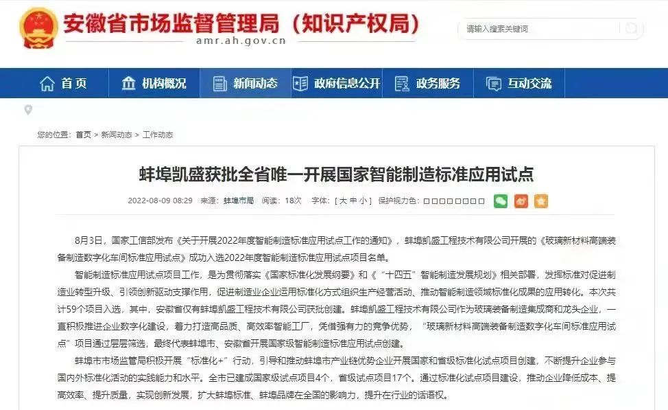 全國59家,安徽省唯一!蚌埠凱盛獲批開展國家智能制造標準應用試點