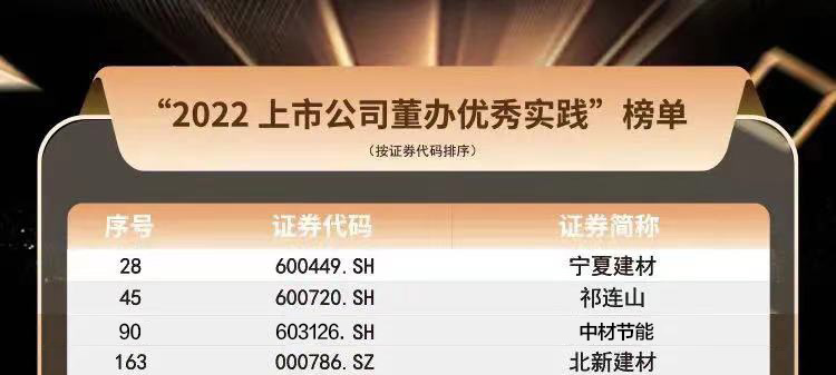 近日,中國上市公司協(xié)會(huì)發(fā)布“2022上市公司董辦最佳實(shí)踐”及“2022上市公司董辦優(yōu)秀實(shí)踐”榜單。集團(tuán)所屬中國建材股份(03323.HK)、天山股份(000877.SZ)、中國巨石(600176.SH)、中材國際(600970.SH)榮獲2022上市公司董辦最佳實(shí)踐獎(jiǎng),所屬上市公司寧夏建材(600449.SH)、祁連山(600720.SH)、中材節(jié)能(603126.SH )及北新建材(000786.SZ)榮獲2022上市公司董辦優(yōu)秀實(shí)踐獎(jiǎng)。