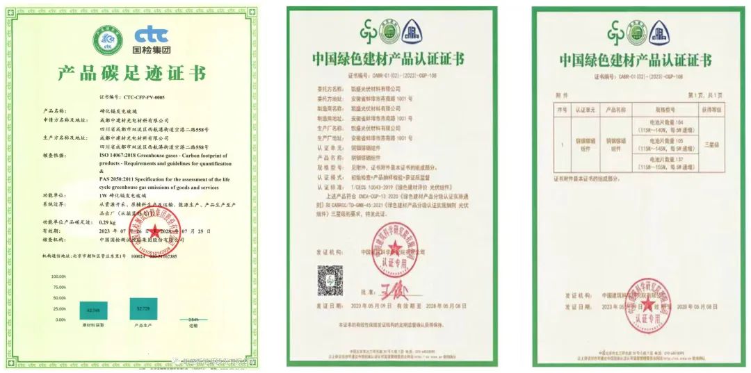 超薄光伏玻璃(1.5㎜-2㎜)不僅具有美學(xué)優(yōu)勢(shì),而且重量輕,便于安裝與維護(hù);發(fā)電玻璃具有弱光性能好、光電轉(zhuǎn)換效率高、成本低、低碳、美觀、安全、可定制的突出特點(diǎn)和生命周期結(jié)束后可回收等的優(yōu)勢(shì)而備受關(guān)注,是實(shí)現(xiàn)節(jié)能減排、領(lǐng)跑建筑風(fēng)尚、掀起新型能源革命的不二選擇。該材料被廣泛應(yīng)用于博鰲亞洲論壇會(huì)議中心、成都大運(yùn)會(huì)、世界科幻大會(huì)等多項(xiàng)國家級(jí)盛會(huì)和上海頂尖科學(xué)家大樓、江蘇天格地板有限公司BIPV光電幕墻等的國內(nèi)地標(biāo)性建筑。 合肥新能源“年產(chǎn)5萬噸二氧化碳捕集提純綠色減排示范項(xiàng)目”、凱盛光伏銅銦鎵硒發(fā)電玻璃成功入選“安徽省十大低碳應(yīng)用場(chǎng)景”。 凱盛光伏取得最高級(jí)別(三星級(jí))“中國綠色建材產(chǎn)品認(rèn)證證書”。 漳州新能源榮獲福建省“綠色工廠”。 成都中建材取得《產(chǎn)品碳足跡證書》。