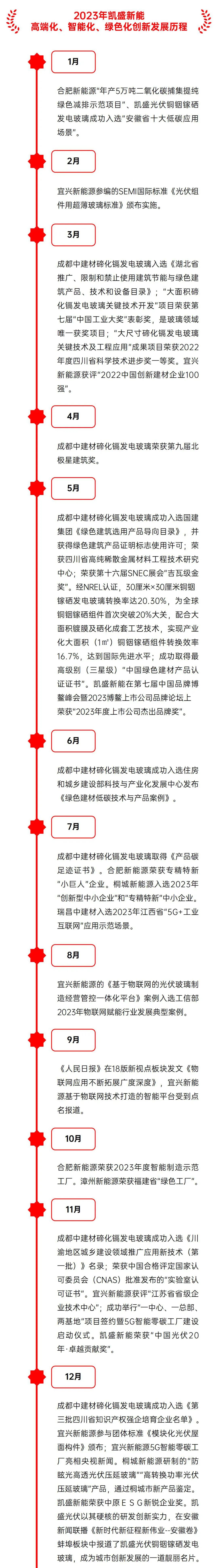 合肥新能源榮獲2023年度“智能制造示范工廠”。 瑞昌中建材入選2023年江西省“5G+工業(yè)互聯(lián)網(wǎng)”應(yīng)用示范場(chǎng)景。 宜興新能源基于物聯(lián)網(wǎng)技術(shù)打造的智能平臺(tái),在《人民日?qǐng)?bào)》18版新視點(diǎn)板塊《物聯(lián)網(wǎng)應(yīng)用不斷拓展廣度深度》一文中,受到點(diǎn)名報(bào)道。 凱盛光伏銅銦鎵硒發(fā)電玻璃在《人民日?qǐng)?bào)》第18版產(chǎn)經(jīng)觀察·傳統(tǒng)產(chǎn)業(yè)新模樣板塊《建筑業(yè)轉(zhuǎn)型升級(jí)展新姿》一文中,受到點(diǎn)名報(bào)道。 中央廣播電視總臺(tái)新聞?lì)l道以“追‘光’逐‘鏈’:集聚綠色發(fā)展的新質(zhì)生產(chǎn)力”為題,報(bào)道了宜興新能源在光伏行業(yè)“5G智能零碳工廠”創(chuàng)新發(fā)展成果。 綠色化
