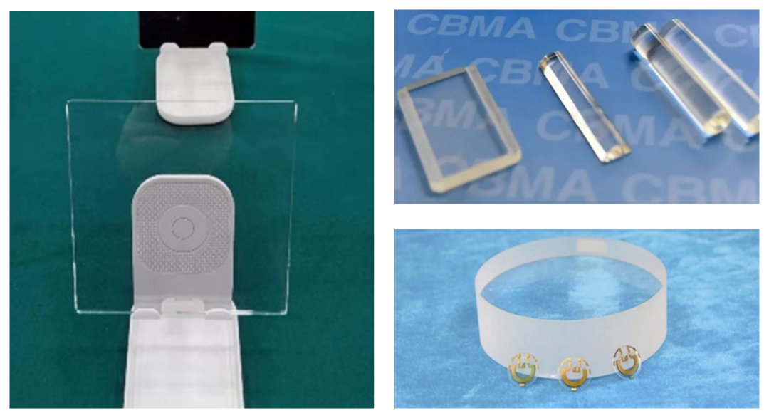 展出的光掩膜石英玻璃(左)耐輻照濾紫外石英玻璃(右上)高純石英玻璃(右下)
