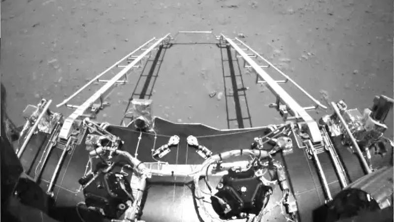 該圖由火星車前避障相機(jī)拍攝,正對(duì)火星車前進(jìn)方向。圖中可見坡道機(jī)構(gòu)展開正常,圖像上部兩個(gè)伸桿為已經(jīng)展開到位的次表層雷達(dá),其中巡視器次表層探測雷達(dá)天線罩管為哈玻院配套研制。(國家航天局供圖)