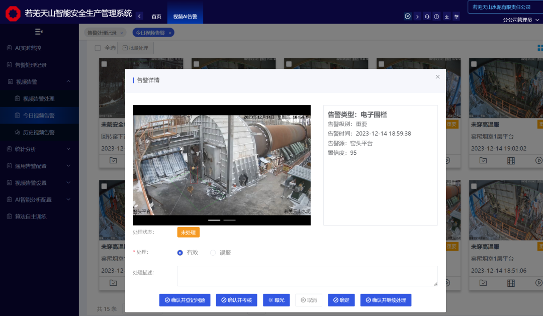 若羌天山始終堅持“安全第一、預(yù)防為主、綜合治理”的安全方針,并獲評安全標準化二級企業(yè)。近年來,若羌天山扎實推進數(shù)字化轉(zhuǎn)型工作,2023年在中建材信云智聯(lián)科技有限公司(以下簡稱“信云智聯(lián)”)的助力下,完成智能安全生產(chǎn)管理系統(tǒng)的建設(shè)部署并上線運行,經(jīng)過智能化、數(shù)字化建設(shè),公司在安全業(yè)務(wù)管理、智能視頻AI、一臉通、人員定位等方面落地了諸多數(shù)字化應(yīng)用場景,為企業(yè)安全管理工作提供了高效的監(jiān)管手段和數(shù)字化平臺。