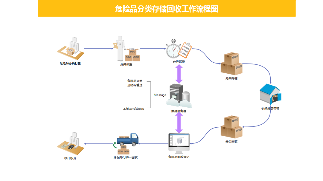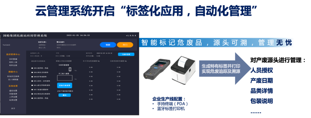 “云管理”是本設(shè)施及系統(tǒng)的核心關(guān)鍵點(diǎn),通過(guò)云管理系統(tǒng),用戶只需采用設(shè)施中的手持終端、藍(lán)牙標(biāo)簽打印機(jī)等進(jìn)行“掃碼”,即可生成一個(gè)專屬標(biāo)簽,完成人員授權(quán)、記錄產(chǎn)廢日期與品類詳情等標(biāo)記,以此對(duì)危廢產(chǎn)生、收集、貯存、處置、利用等核心環(huán)節(jié)進(jìn)行全程信息化跟蹤管理,讓危廢從入庫(kù)到回收,實(shí)現(xiàn)來(lái)源可查、去向可追。