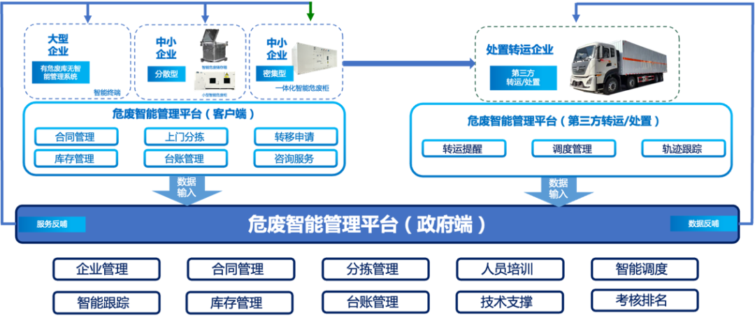 平臺(tái)利用物聯(lián)網(wǎng)、大數(shù)據(jù)和人工智能技術(shù),通過(guò)智能終端進(jìn)行大型園區(qū)危險(xiǎn)廢物的智能化管理,實(shí)現(xiàn)了“企業(yè)端”“政府端”等多端口的綜合聯(lián)通及調(diào)度,不僅幫助園區(qū)內(nèi)的產(chǎn)廢企業(yè)實(shí)現(xiàn)了安全管理、妥善轉(zhuǎn)運(yùn)及效率的提升,同時(shí)也為園區(qū)及政府提供了有力的監(jiān)管手段。