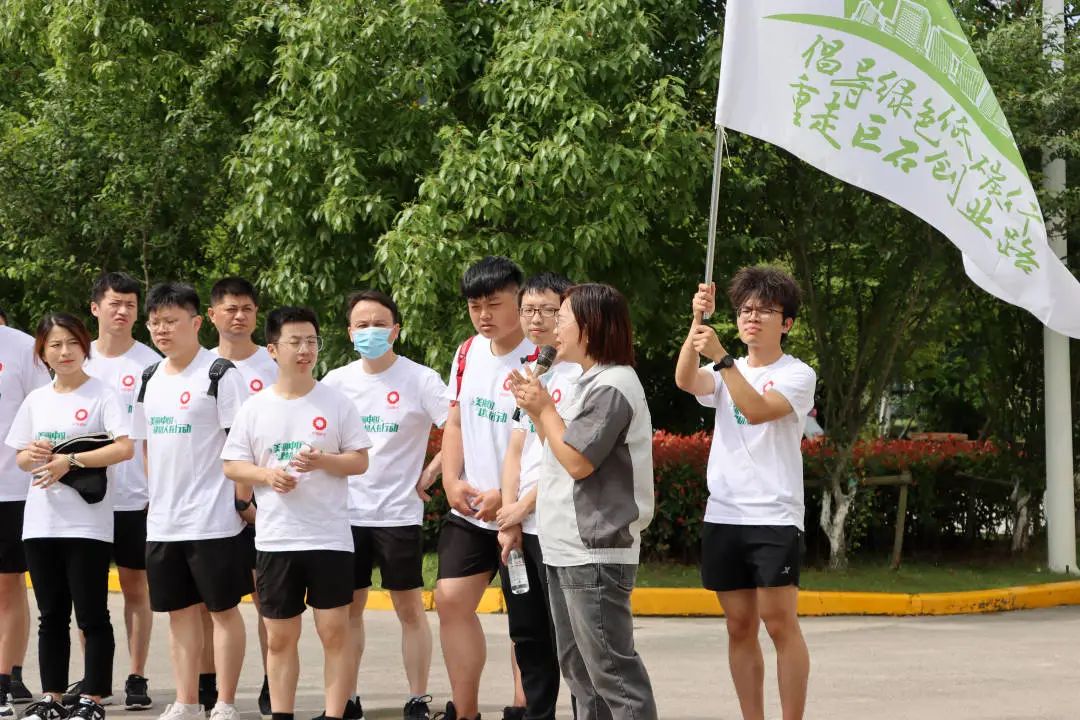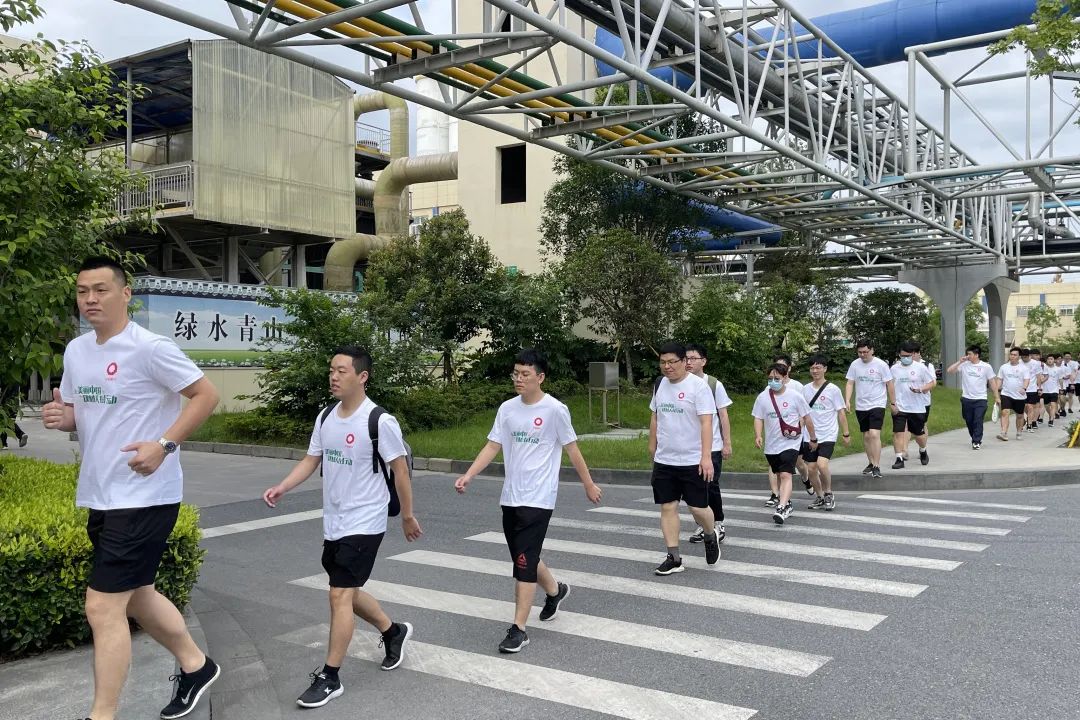 本次“倡導綠色低碳行 重走巨石創(chuàng)業(yè)路”徒步活動從智能制造基地出發(fā),白綠相間的徒步隊伍,穿梭在現(xiàn)代化的“綠色工廠”步行道上,一旁的“兩山”理論、“四不原則”格外顯眼,“綠色、低碳、環(huán)保!”嘹亮的口號,整齊的隊伍,展現(xiàn)出巨石人積極向上的精神風貌。