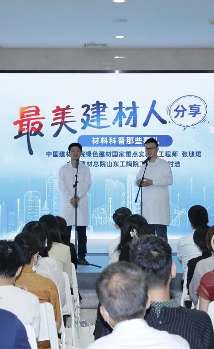 本屆啟動(dòng)儀式特別邀請(qǐng)最美建材人的代表進(jìn)行現(xiàn)場(chǎng)分享,全國(guó)勞動(dòng)模范、天津水泥院數(shù)字化研究所所長(zhǎng)胡亞東講述了“走出舒適區(qū),才能突破自我”的智能化歷程,人工晶體研究院副總經(jīng)理訾蓬講述了科技成果轉(zhuǎn)化探索的故事,受到參與人員一致好評(píng)。90后最美建材人代表張琎珺、劉時(shí)浩以生動(dòng)有趣的脫口秀形式分享他們的故事,展現(xiàn)一線的青年科技工作者愛國(guó)愛企、創(chuàng)新自強(qiáng)的責(zé)任與情懷。