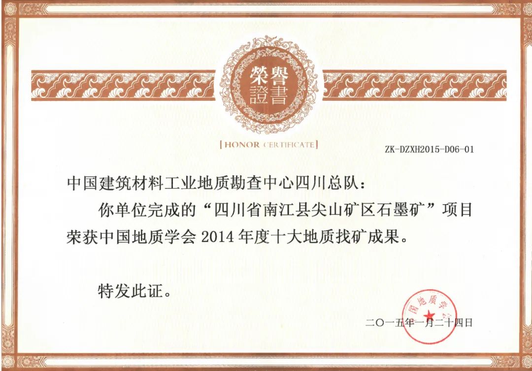 四川總隊榮獲中國地質(zhì)學(xué)會2014年度十大地質(zhì)找礦成果
