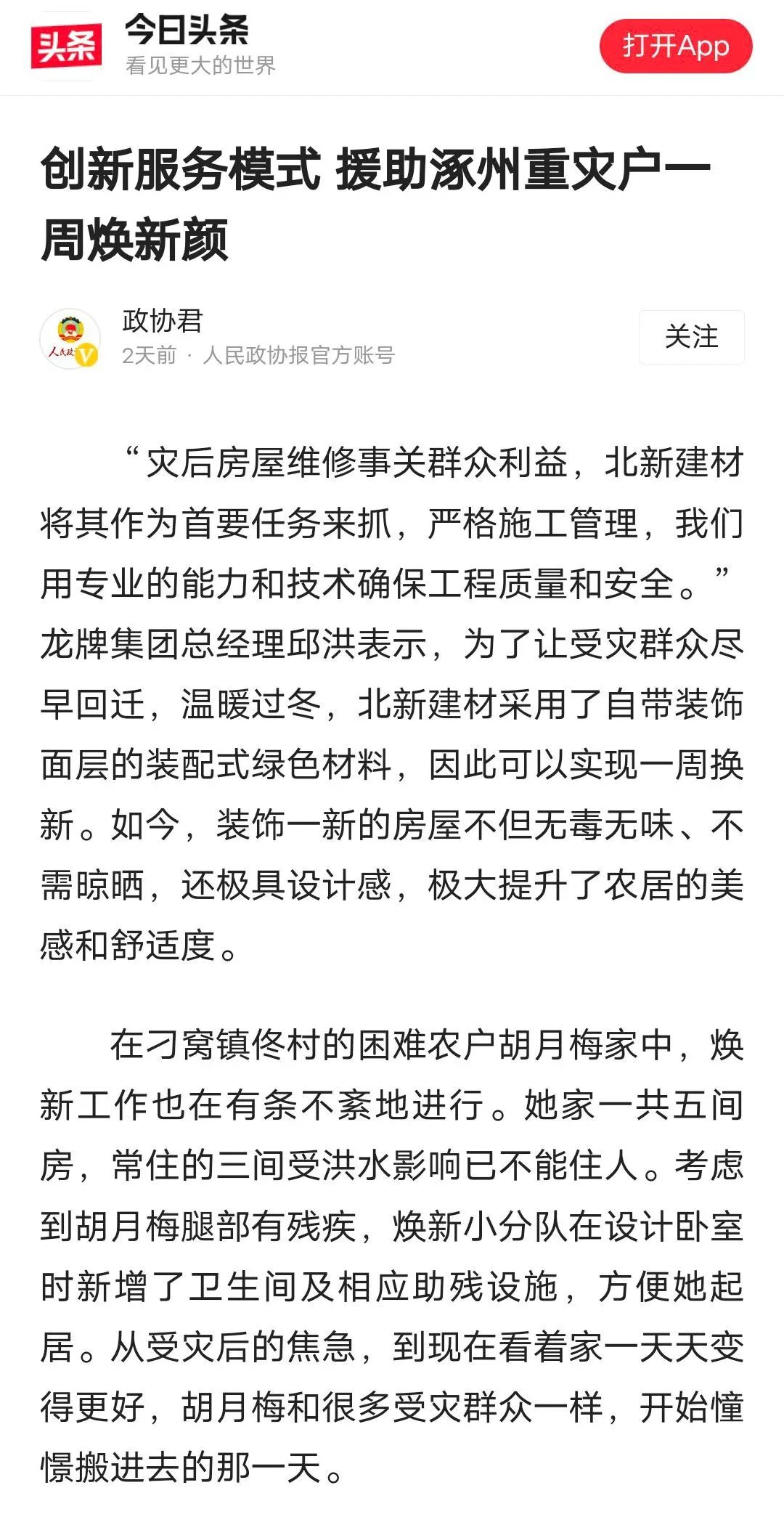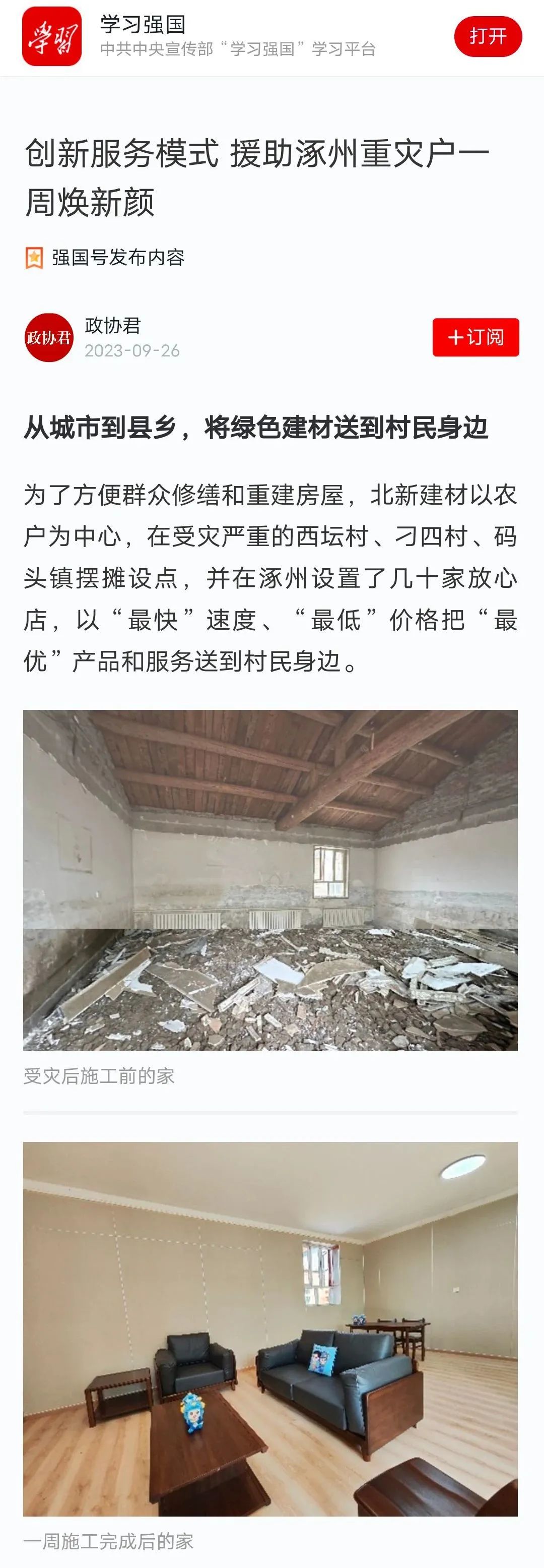 人民政協(xié)網(wǎng)從“創(chuàng)新服務模式 援助涿州重災戶一周煥新顏”角度介紹了北新建材踐行央企責任,深入縣鄉(xiāng)災區(qū)一線,積極助力災區(qū)重建,把優(yōu)質建材和服務送到村民身邊,推動“四個轉變服務升級”的創(chuàng)新實踐。