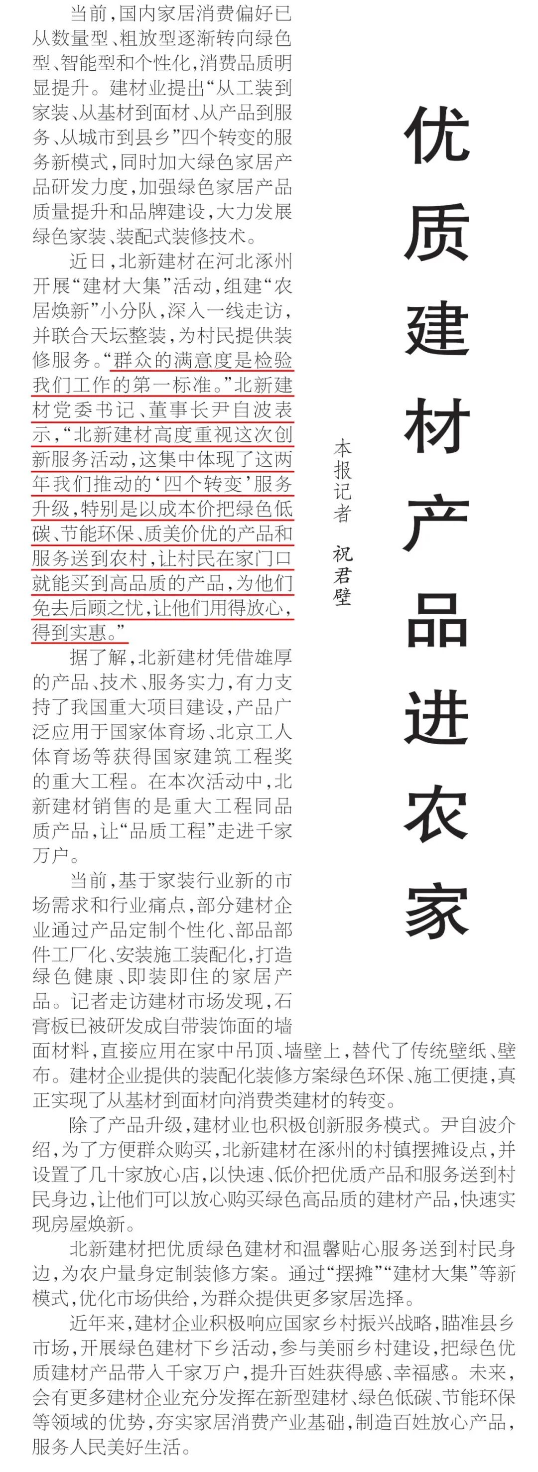 《經(jīng)濟日報》聚焦家居消費市場升級給建材行業(yè)帶來的新變化,北新建材響應國家鄉(xiāng)村振興戰(zhàn)略,積極推進“四個轉變”,創(chuàng)新服務模式,把重大工程同品質產(chǎn)品帶到村民家門口,服務人民美好生活。