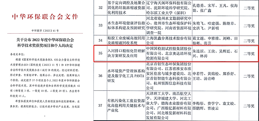 今年4月,由國檢集團(tuán)及所屬北京奧達(dá)清公司共同完成的《入河排口精細(xì)化管理解決方案研發(fā)及應(yīng)用》,榮獲2022年度中華環(huán)保聯(lián)合會(huì)科學(xué)技術(shù)獎(jiǎng)二等獎(jiǎng),這是國檢集團(tuán)在環(huán)保行業(yè)第三方綜合技術(shù)服務(wù)領(lǐng)域一次重要突破。
