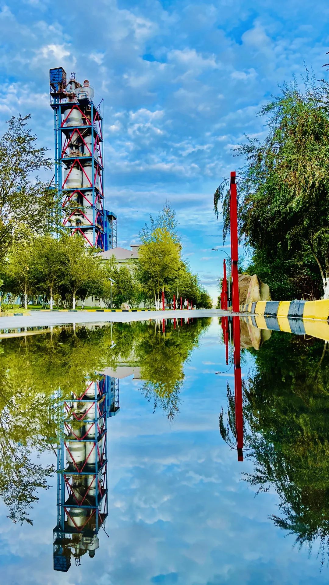 高聳入云的預熱器,青綠色的草和樹