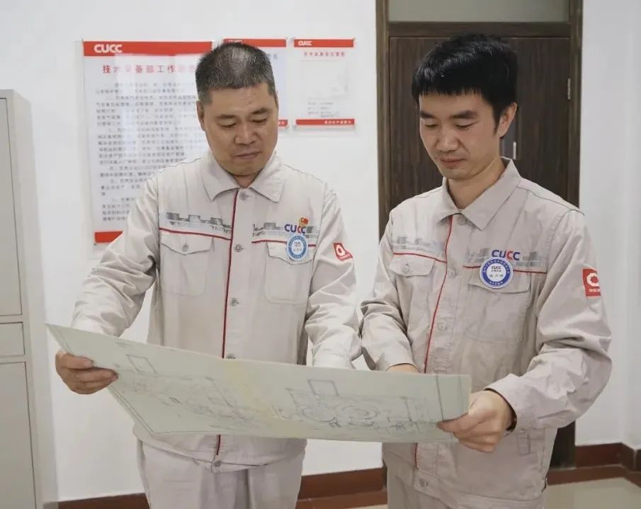 臥龍中聯(lián)技術(shù)裝備部楊國華(左)給徒弟楊少坤講解設(shè)備、工藝圖紙。