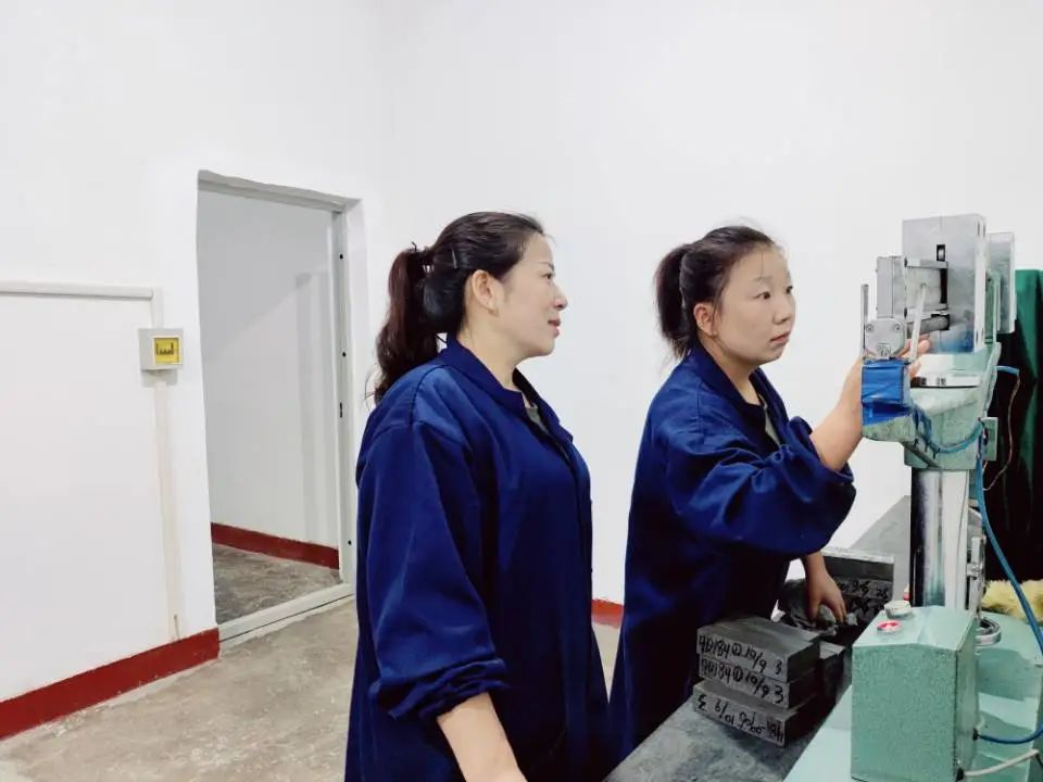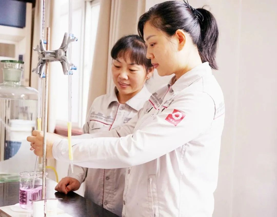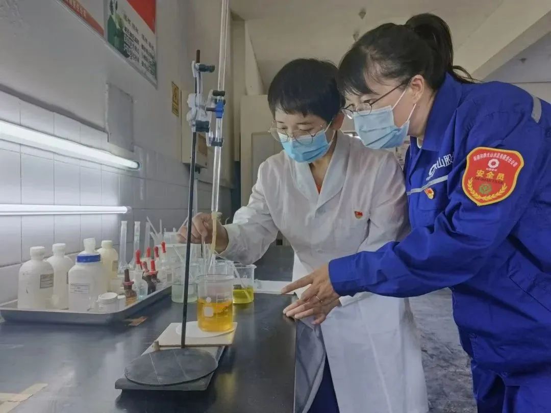 臥龍中聯(lián)化驗室高華茹(左)給徒弟尤曉茹(右)講解滴定方法。