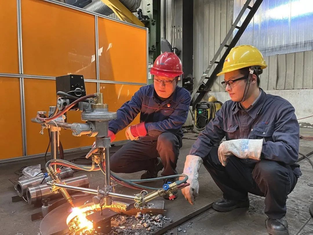 中國聯(lián)合裝備合肥神馬結(jié)構(gòu)分廠員工周偉(左)對徒弟夏林進行半自動火焰切割的一對一教學(xué),通過師帶徒的方式傳承焊接工藝。