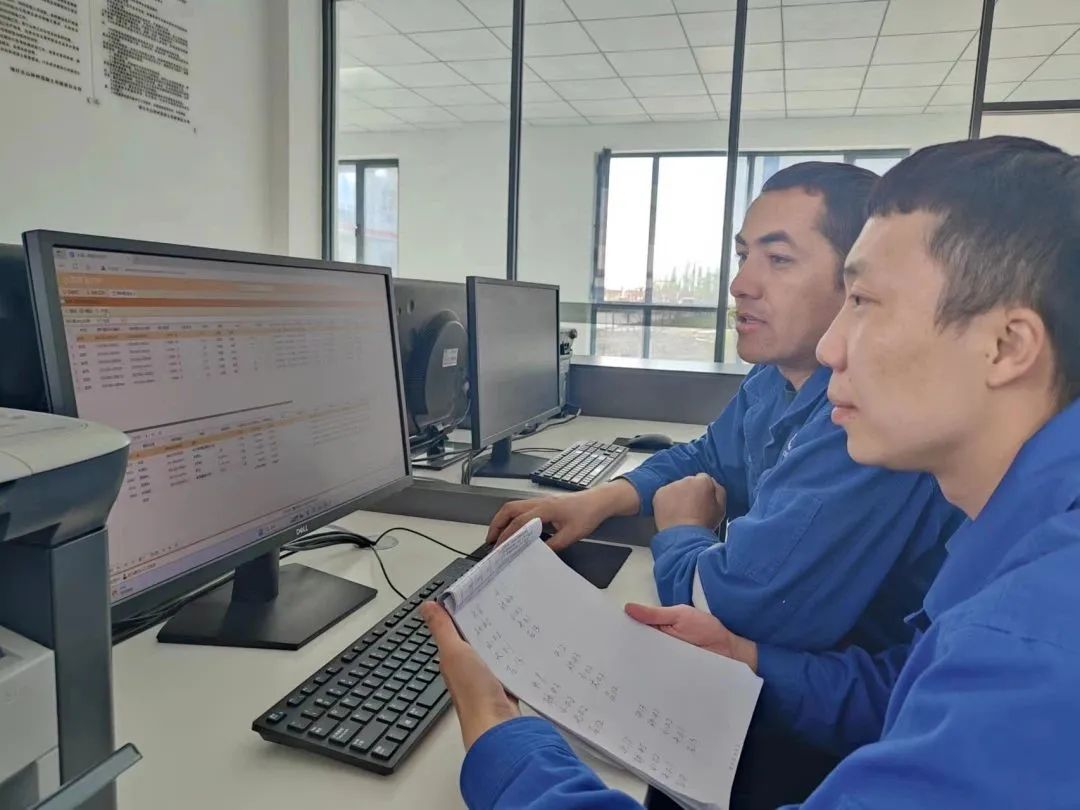 葉城天山劉泰明為徒弟趙鵬山講解回轉(zhuǎn)窯操作原理,傳授操作經(jīng)驗,幫助年輕職工在崗位上成長成才。