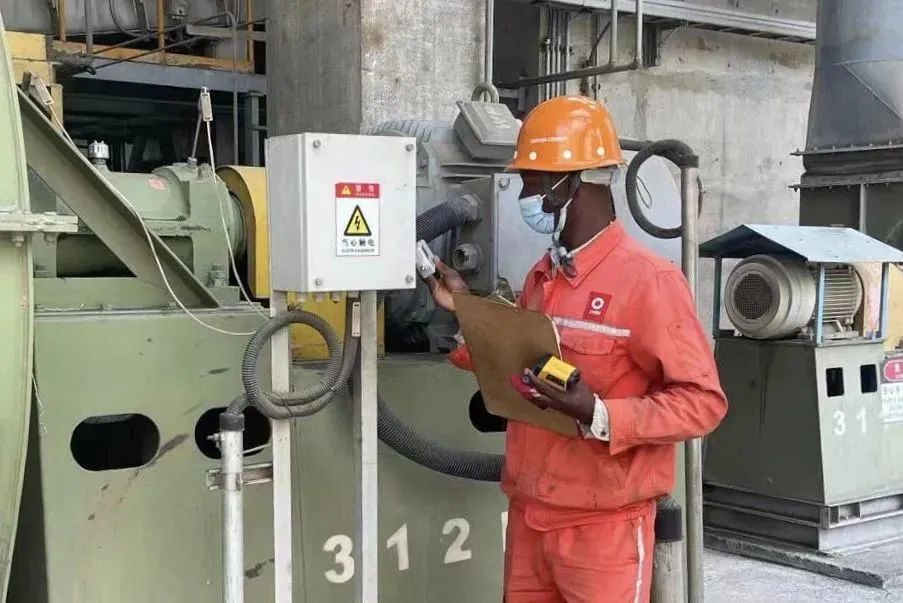 中國建材贊比亞工業(yè)園的本地員工在對窯頭設(shè)備進行維護檢查。