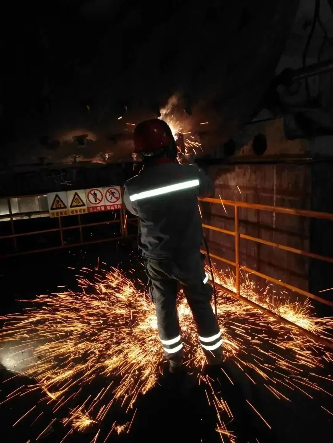 甕安縣玉山水泥生產(chǎn)部員工吳健華技能比武活動中發(fā)揮工匠精神,展示焊接技術(shù),綻放鐵花之美。